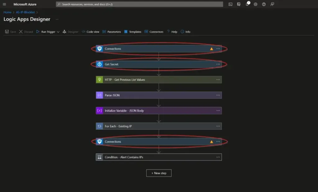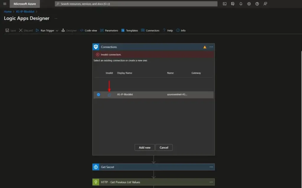 To validate the connections created for this playbook, expand the “Connections” step and click the exclamation point icon next to the name matching the playbook.