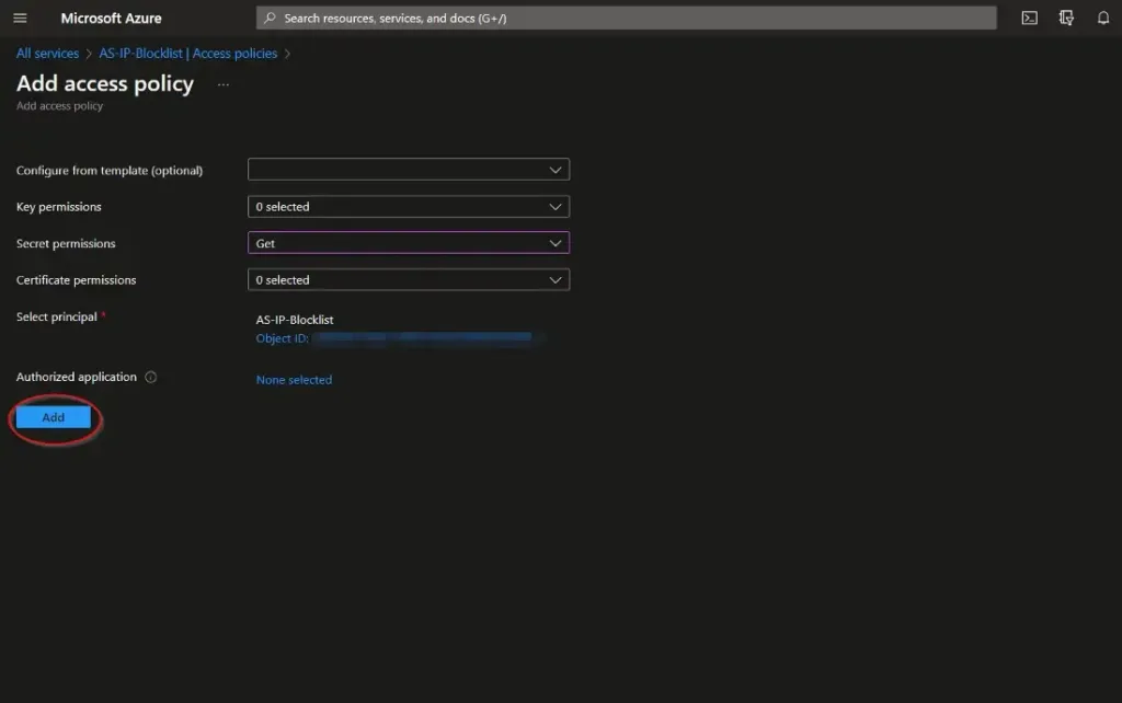 From the Key Vault “Access policies” page, click “Add Access Policy”.