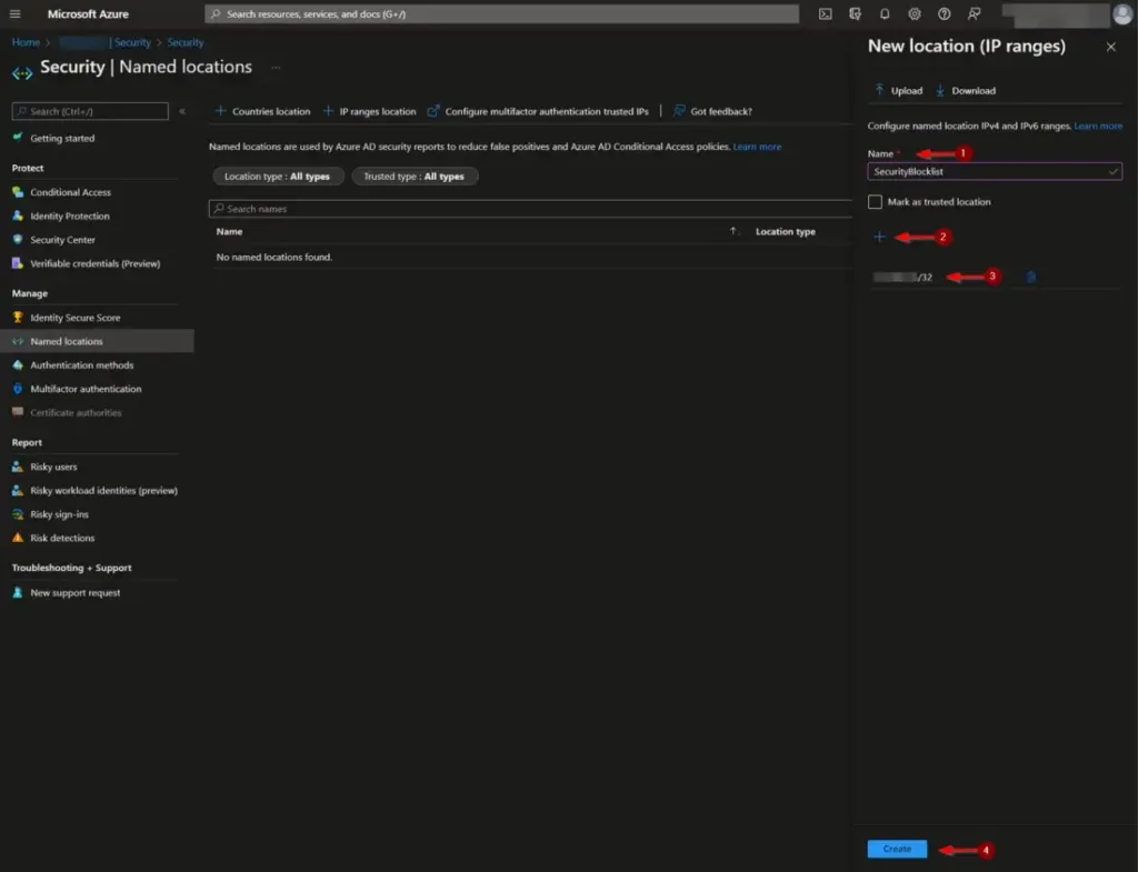 Navigate to the “Named locations” menu option and then click “IP ranges location”.