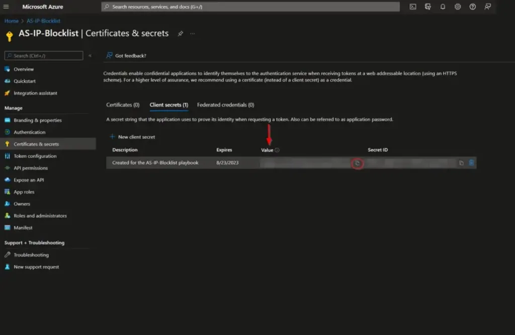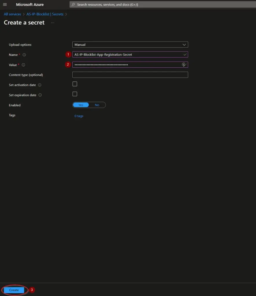 Choose a name for the secret, such as “AS-IP-Blocklist-App-Registration-Secret”, and enter the App Registration Secret copied previously in the “Value” field. All other settings can be left as is.