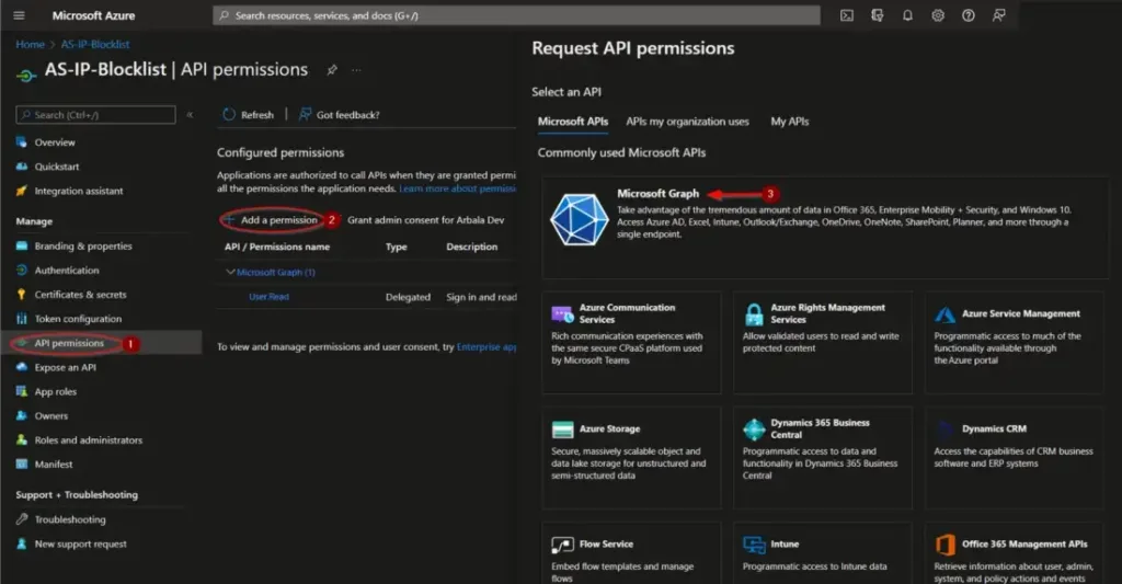 From the application menu blade, select “API permissions” and then click “Add a permission”.