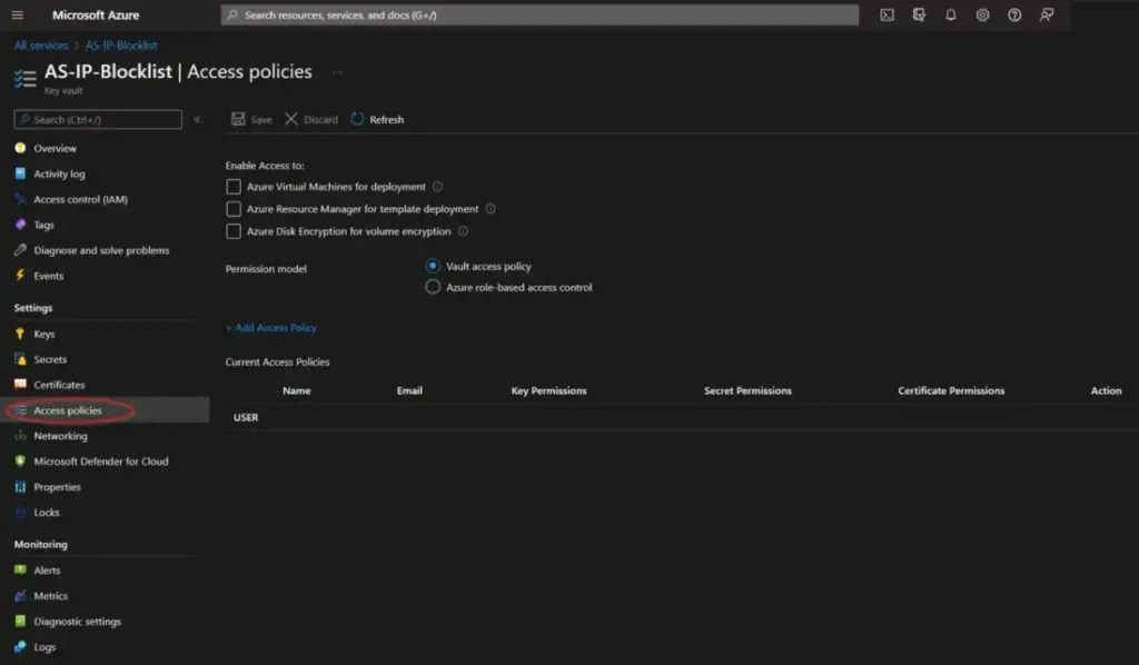 Once your secret has been added to the vault, navigate to the “Access policies” menu option, also found under the “Settings” section on the Key Vault page menu.