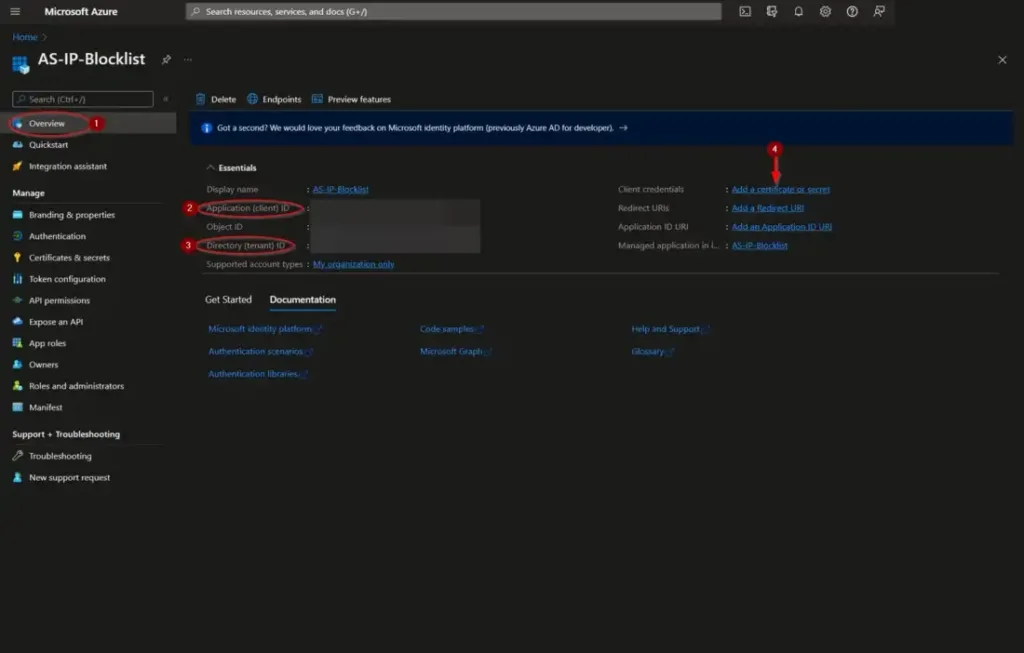 Navigate back to the “Overview” section on the menu and take note of the “Application (client) ID” and “Directory (tenant) ID“, as each will be needed for the deployment of this playbook.