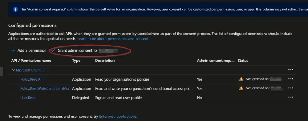 Under “Application permissions”, search for “Policy”, then select the “Policy.Read.All” and ”Policy.ReadWrite.ConditionalAccess” checkboxes.