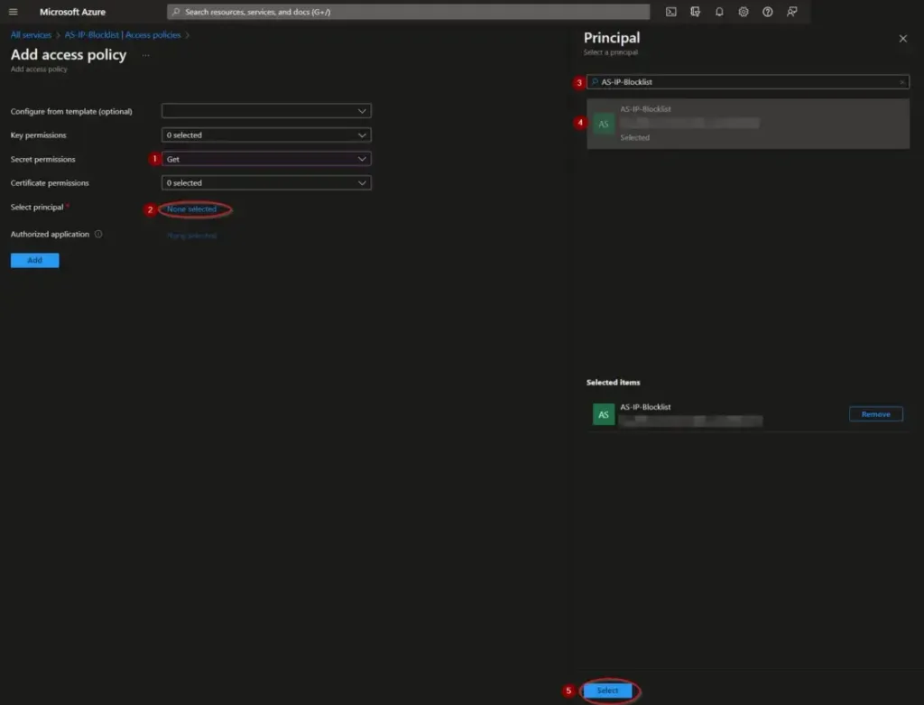 Select the “Get” checkbox in the “Secret permissions” list field. Then click the blue “None selected” text next to the “Select principal” field.