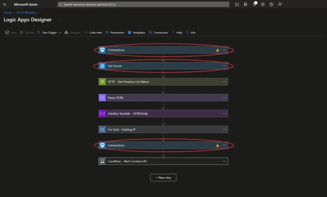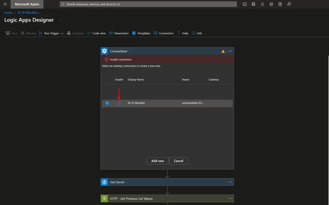 To validate the connections created for this playbook, expand the “Connections” step and click the exclamation point icon next to the name matching the playbook.