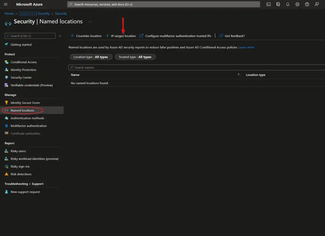 Navigate to the “Named locations” menu option and then click “IP ranges location”.