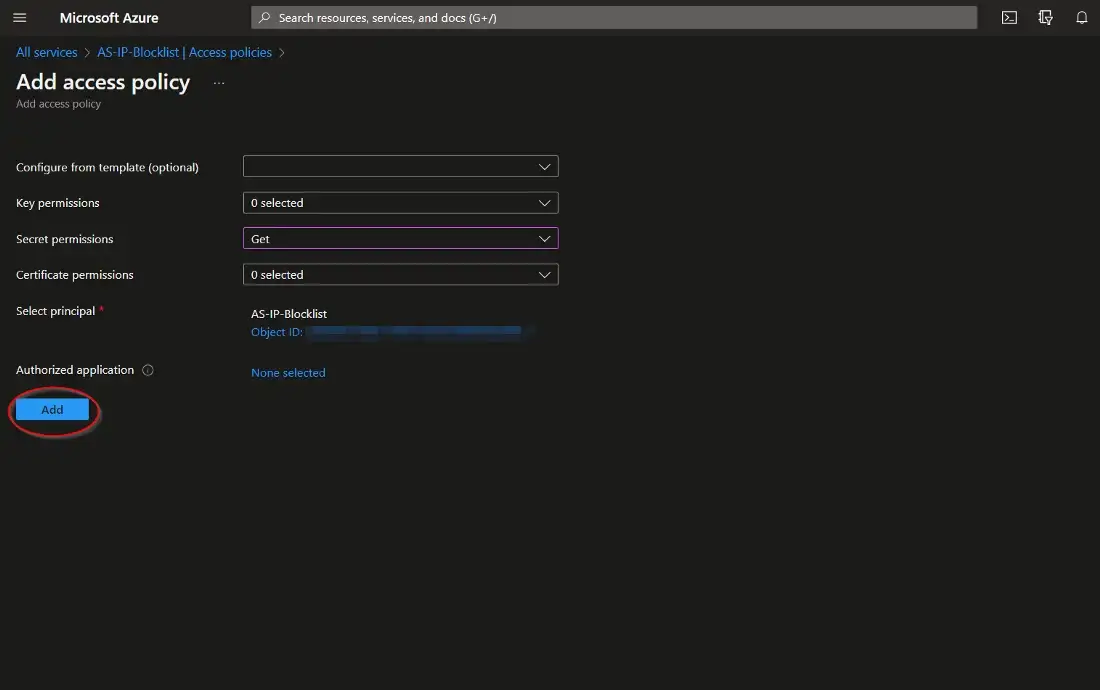 From the Key Vault “Access policies” page, click “Add Access Policy”.