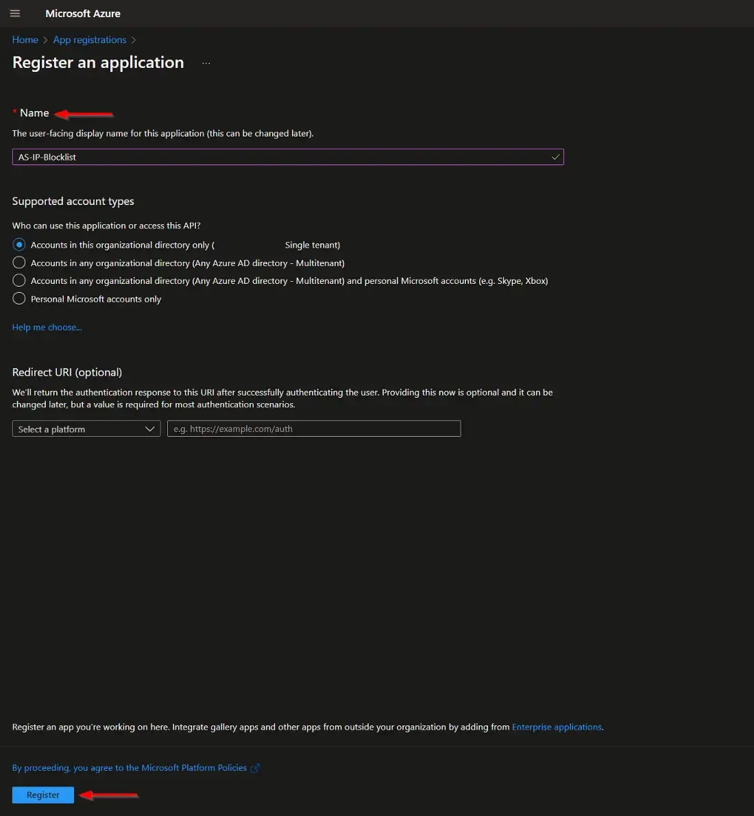 Select a name for your App Registration, such as “AS-IP-Blocklist”, then click “Register”.