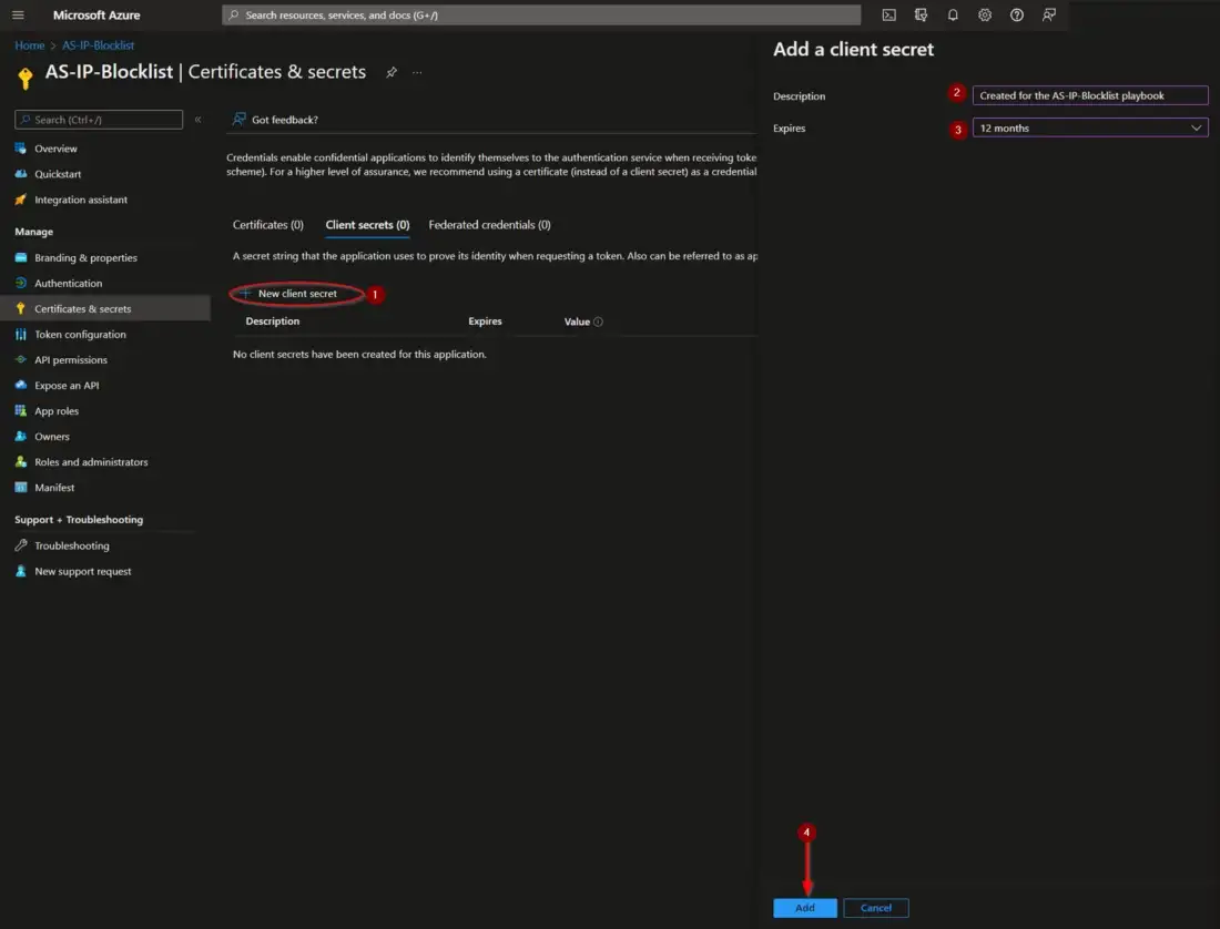 Click “New client secret”. After adding a description and selecting an expiration date, click “Add”.
