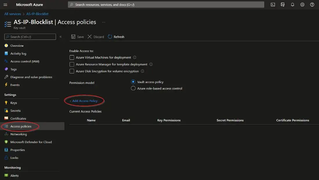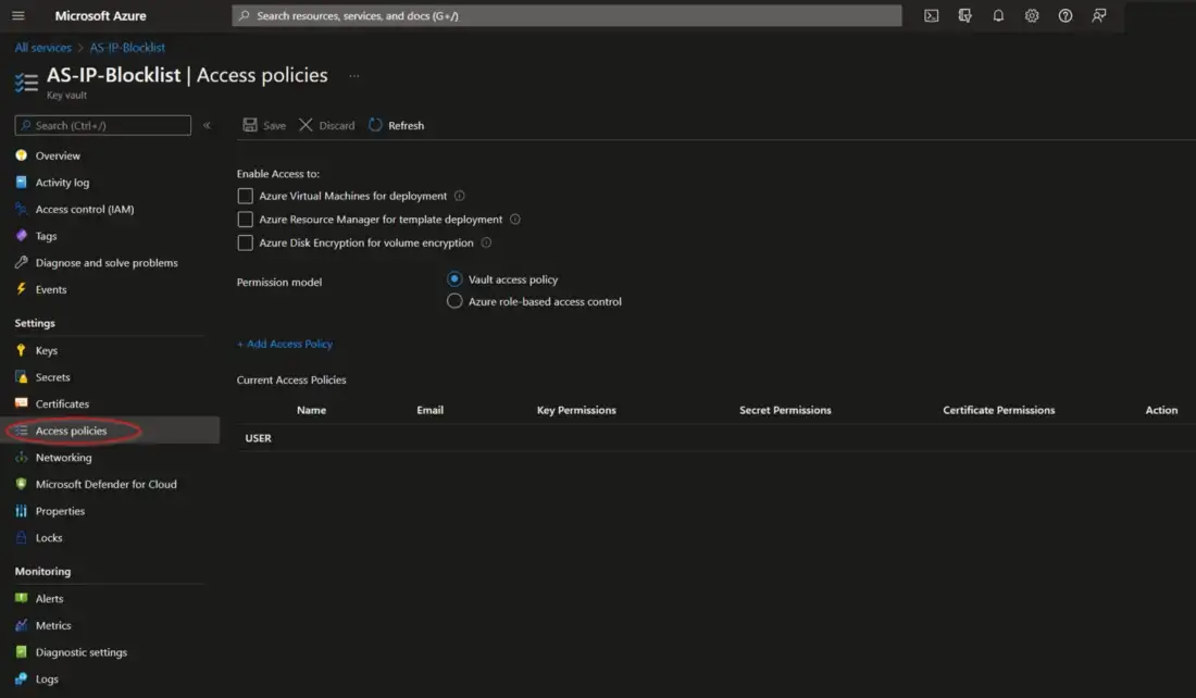 Once your secret has been added to the vault, navigate to the “Access policies” menu option, also found under the “Settings” section on the Key Vault page menu.