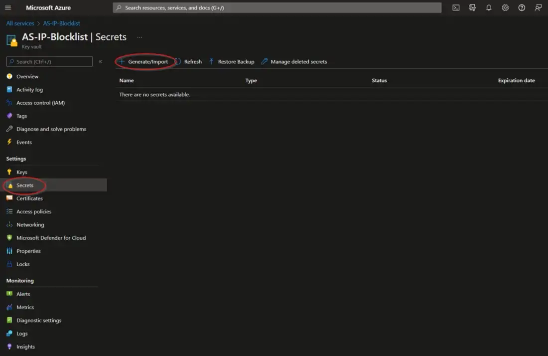 Choose a name for the secret, such as “AS-IP-Blocklist-App-Registration-Secret”, and enter the App Registration Secret copied previously in the “Value” field. All other settings can be left as is.