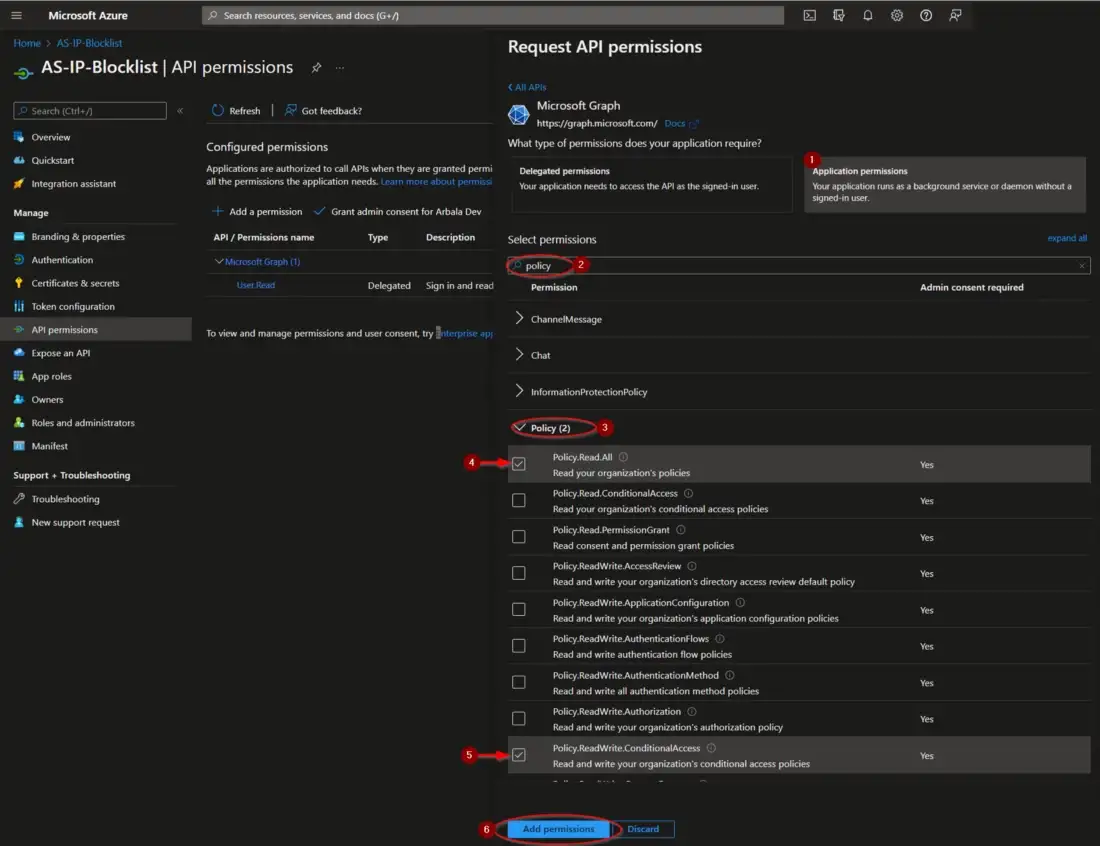 Under “Application permissions”, search for “Policy”, then select the “Policy.Read.All” and ”Policy.ReadWrite.ConditionalAccess” checkboxes.
