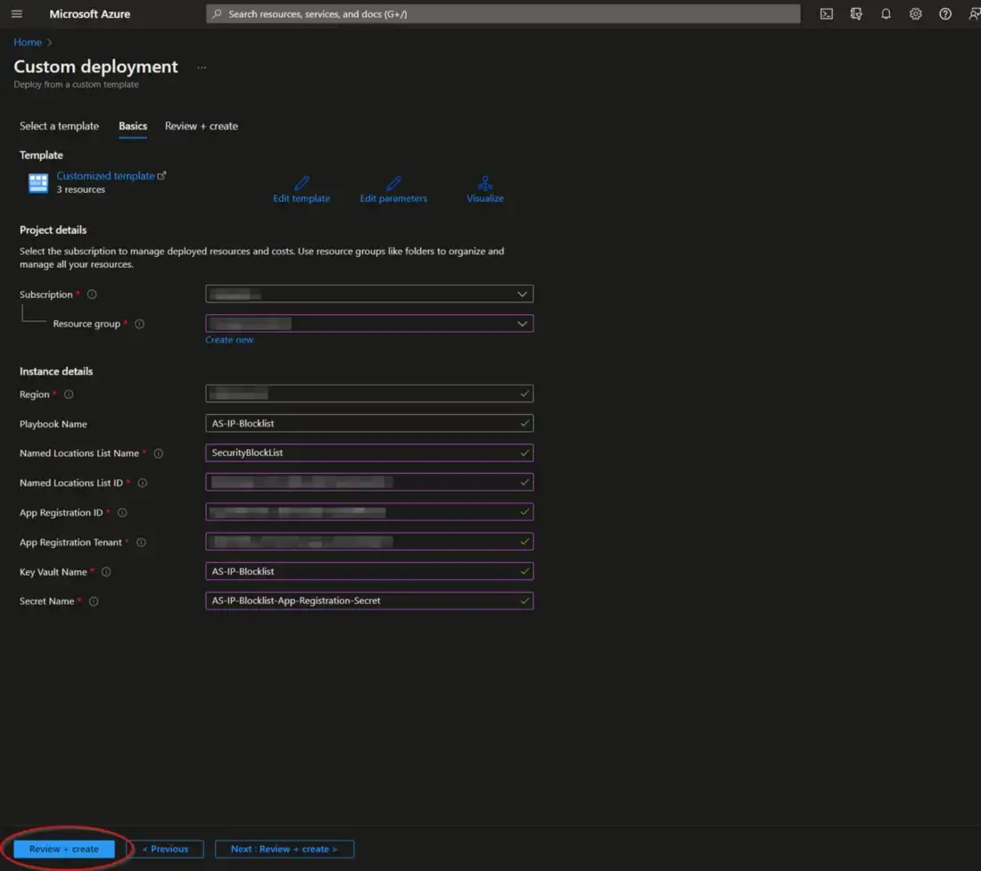 - Select the “Subscription” and “Resource Group” from the dropdown boxes you would like the playbook deployed.